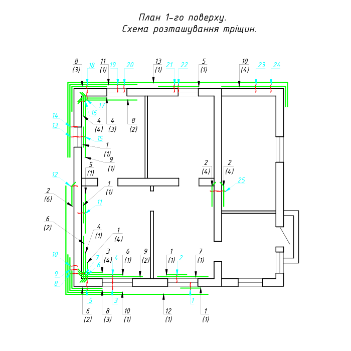 - Тріщини у зовнішніх стінах різної орієнтації;