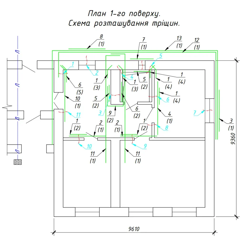Під час візуального огляду у вересні 2025 р. представниками ТОВ «Статистичні Системи» були зафіксовані тріщини (вертикальні, діагональні) несучих елементів (стін, фундаментів) будинку.